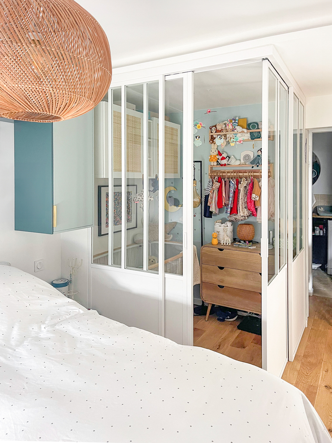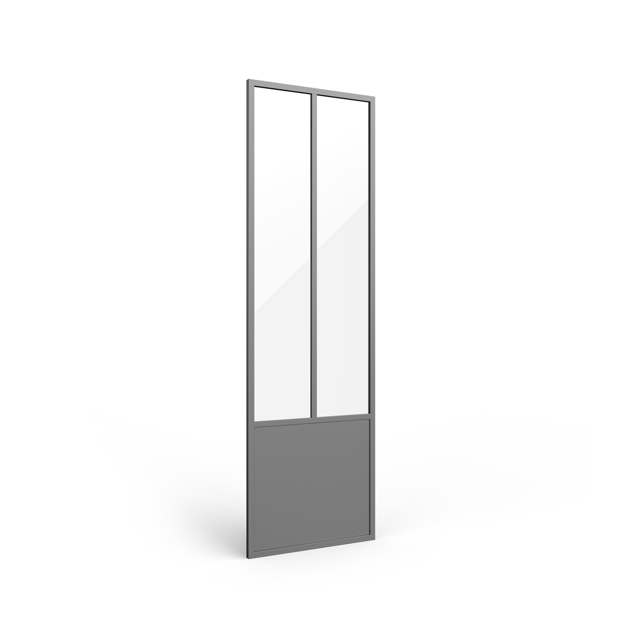 Son soubassement en acier apporte une touche graphique et protège le bas de la cloison, tandis que la partie vitrée laisse passer généreusement la lumière.