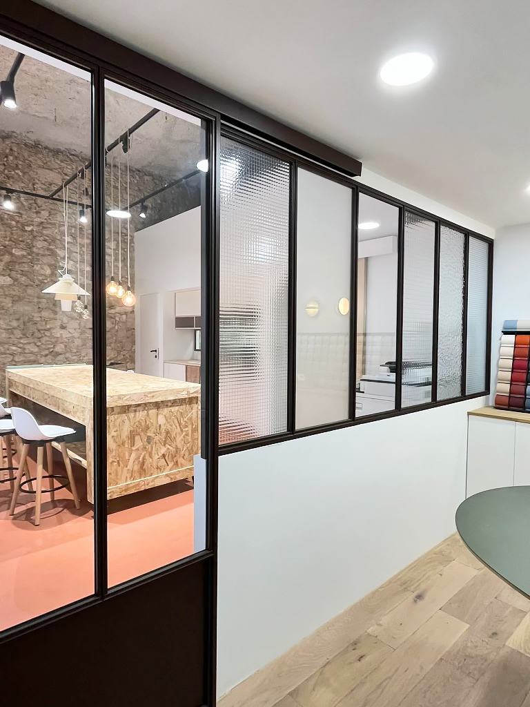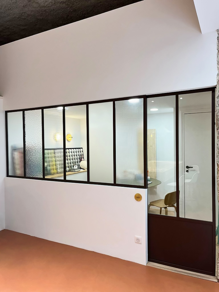 Son soubassement en acier souligne le style atelier tandis que la partie vitrée laisse passer la lumière naturelle et agrandit visuellement l’espace.